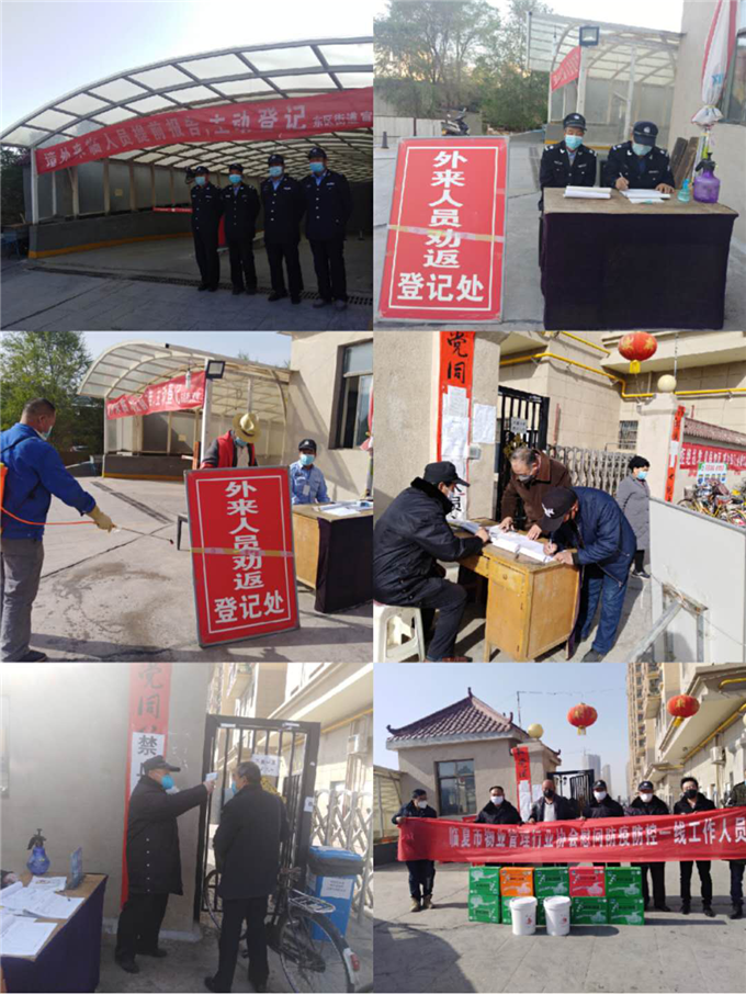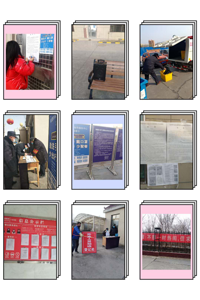 物業(yè)公司通過在小區(qū)、樓道張貼各類通知、通告,利用橫幅、展板等方式加強防控政策宣傳。為防止外來人員進入小區(qū), 降低病毒傳染的可能性,社區(qū)工作人員與我物業(yè)公司對業(yè)主發(fā)放臨時出入證和防控宣傳單。提醒業(yè)主盡量少出門、不聚集,對不自覺佩戴口罩的業(yè)主進行勸阻,并對進出人員開展體溫檢測及登記 。